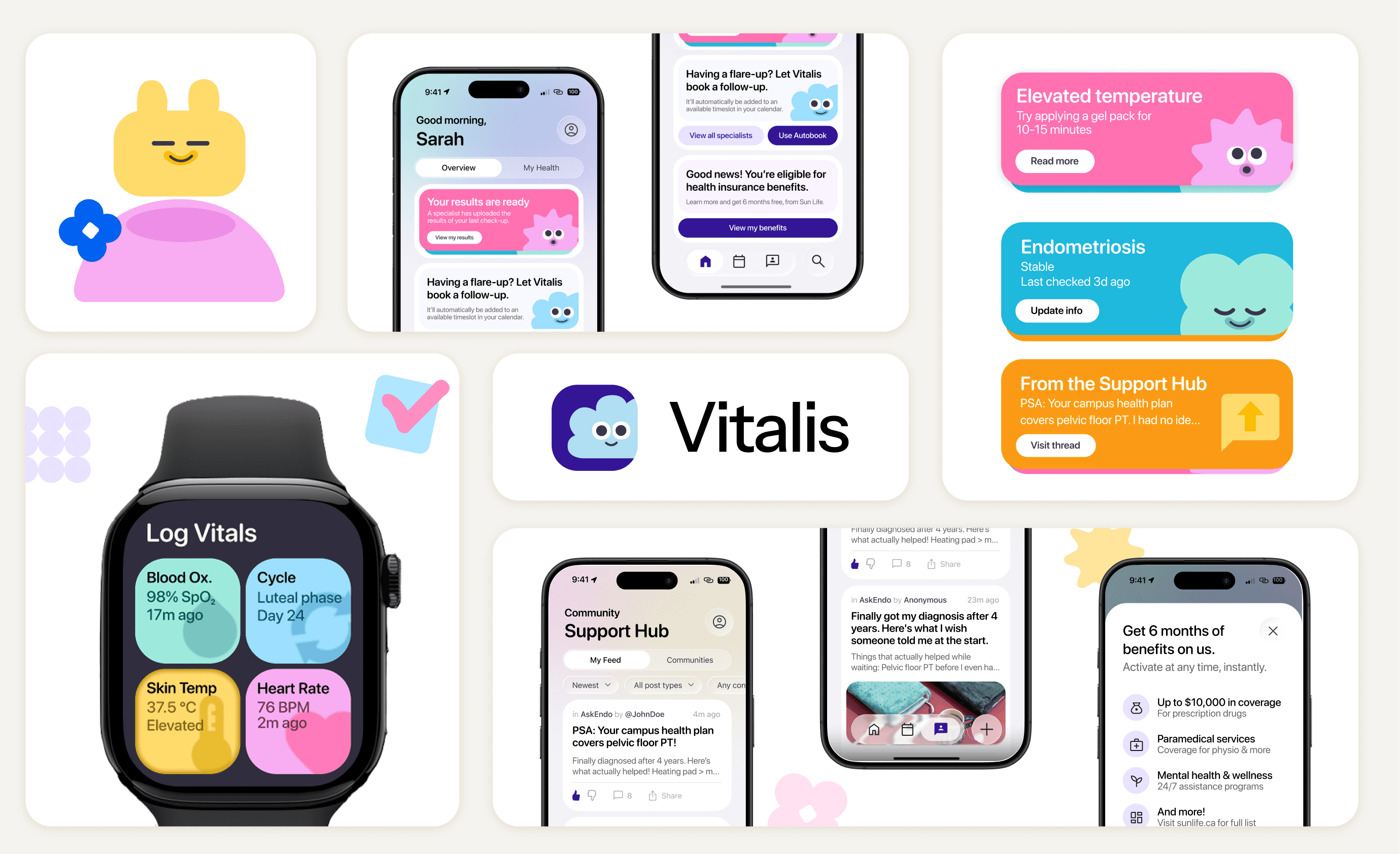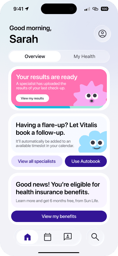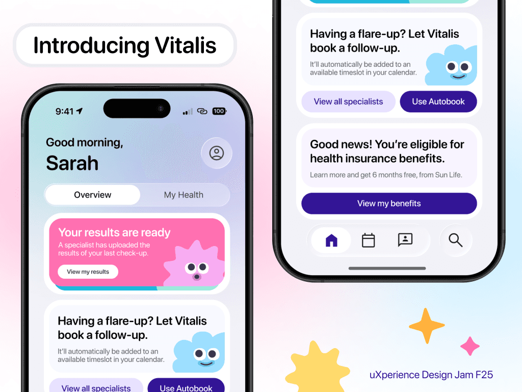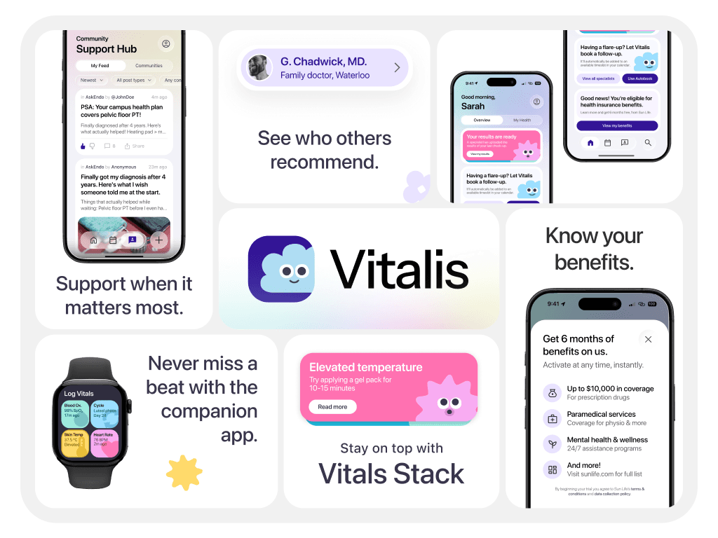 Vitalis is a rapid three‑day designathon concept focused on supporting patients newly diagnosed with chronic conditions. The app streamlines booking, benefits guidance, health tracking, and community support, with an optional feature that connects users to Sun Life for personalized benefits information.