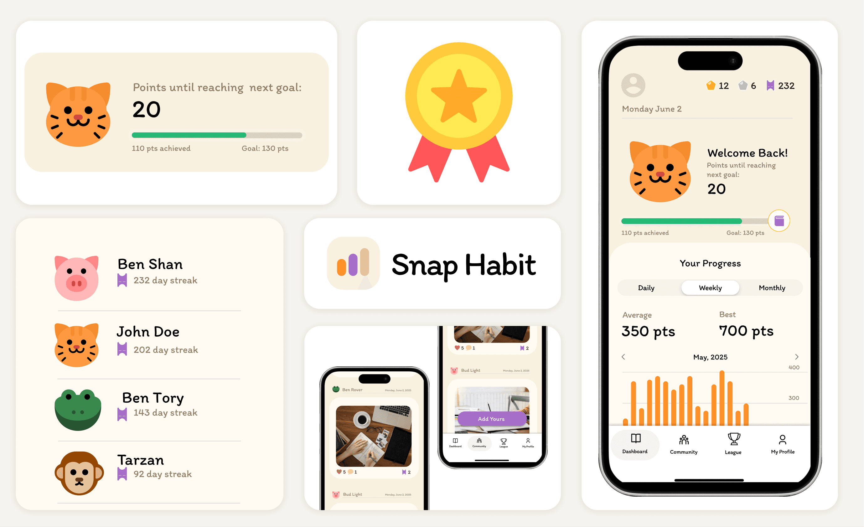 SnapHabit is a habit tracking mobile app designed to help users build consistency through simple check-ins and visual progress tracking. The app focuses on reducing friction in daily habit tracking by using an intuitive interface, friendly visuals, and quick interactions that encourage long term habit formation without feeling overwhelming.